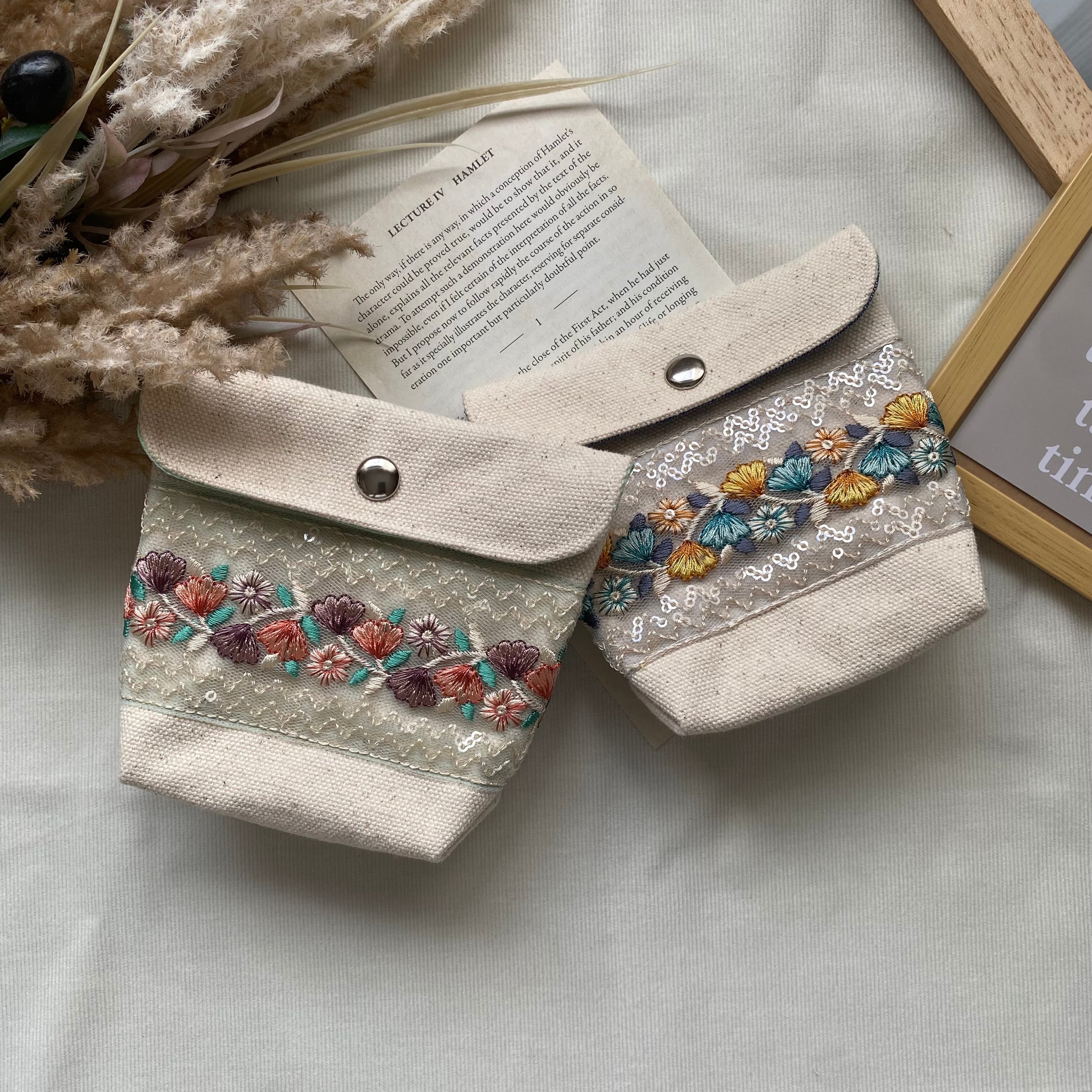 インド刺繍リボンを縫いつけた 手のひらサイズのポーチです 見た目以上に収納力もあります 裏地付きで少ししっかりした作りになってます リップやパウダーマスカラなどを入れて お出かけ用のメイクポーチとして使えます ※写真の写りで色味が変わってますが、1枚目のお写真に近い色味です 【サイズ】 縦 約13cm × 横 約13cm 【素材】 表地:帆布8号/裏地:綿100% 【発送について】 簡易ラッピングでのお届けになります* 普通郵便(またはクリックポスト)にて発送予定です。 *ハンドメイド品のため、多少の個体差や縫い目のゆがみ等がある場合があります。 手作りの味としてご理解いただけたらうれしいです。