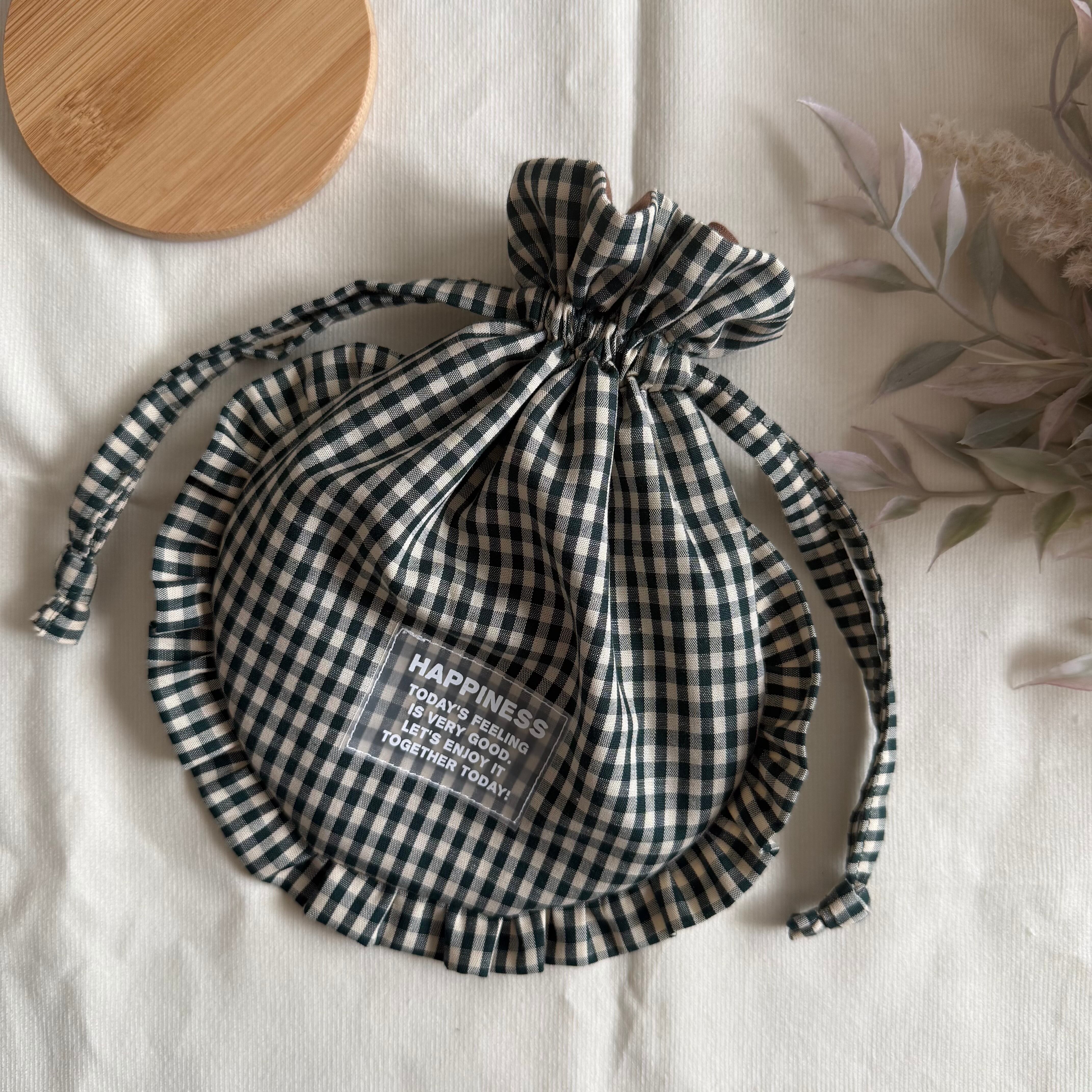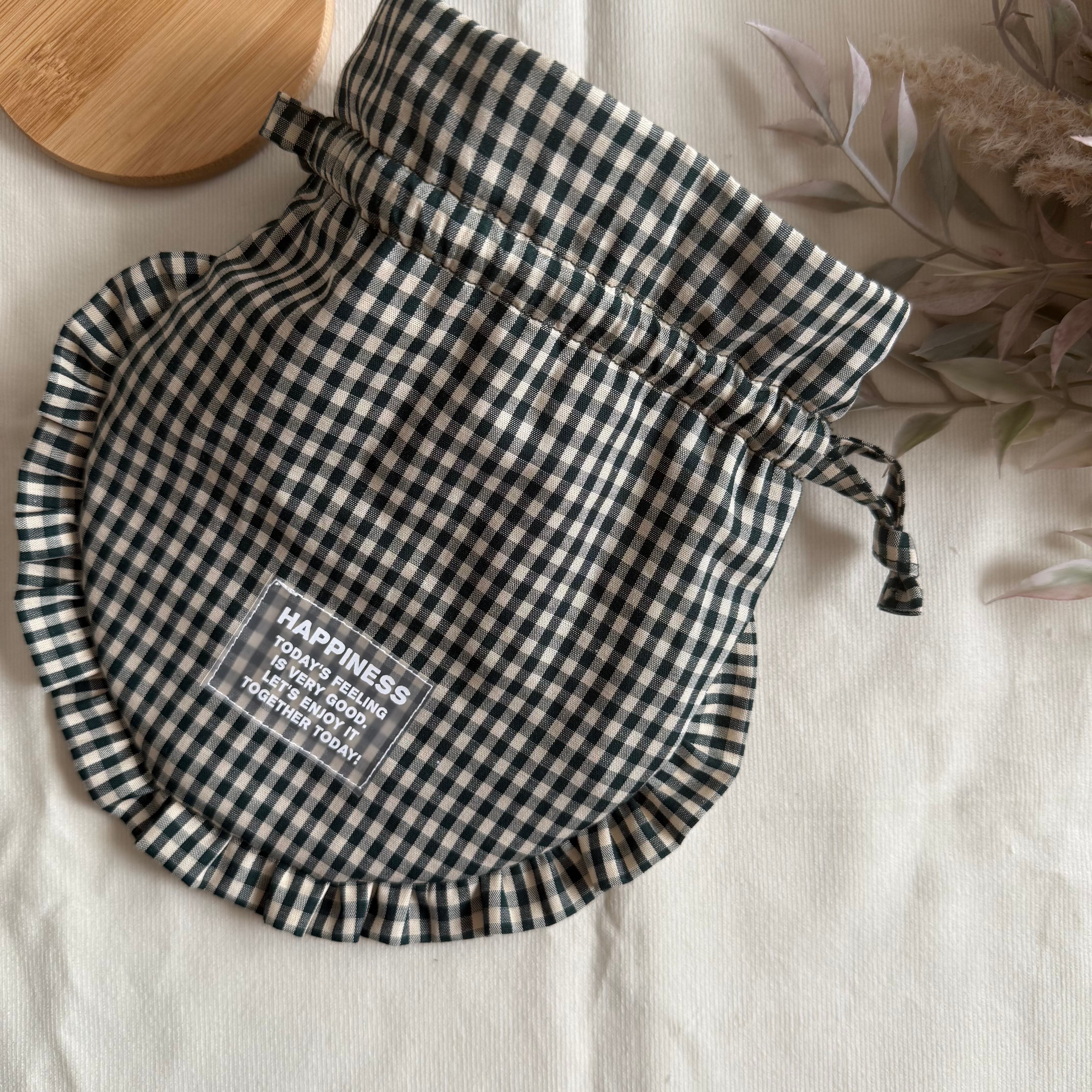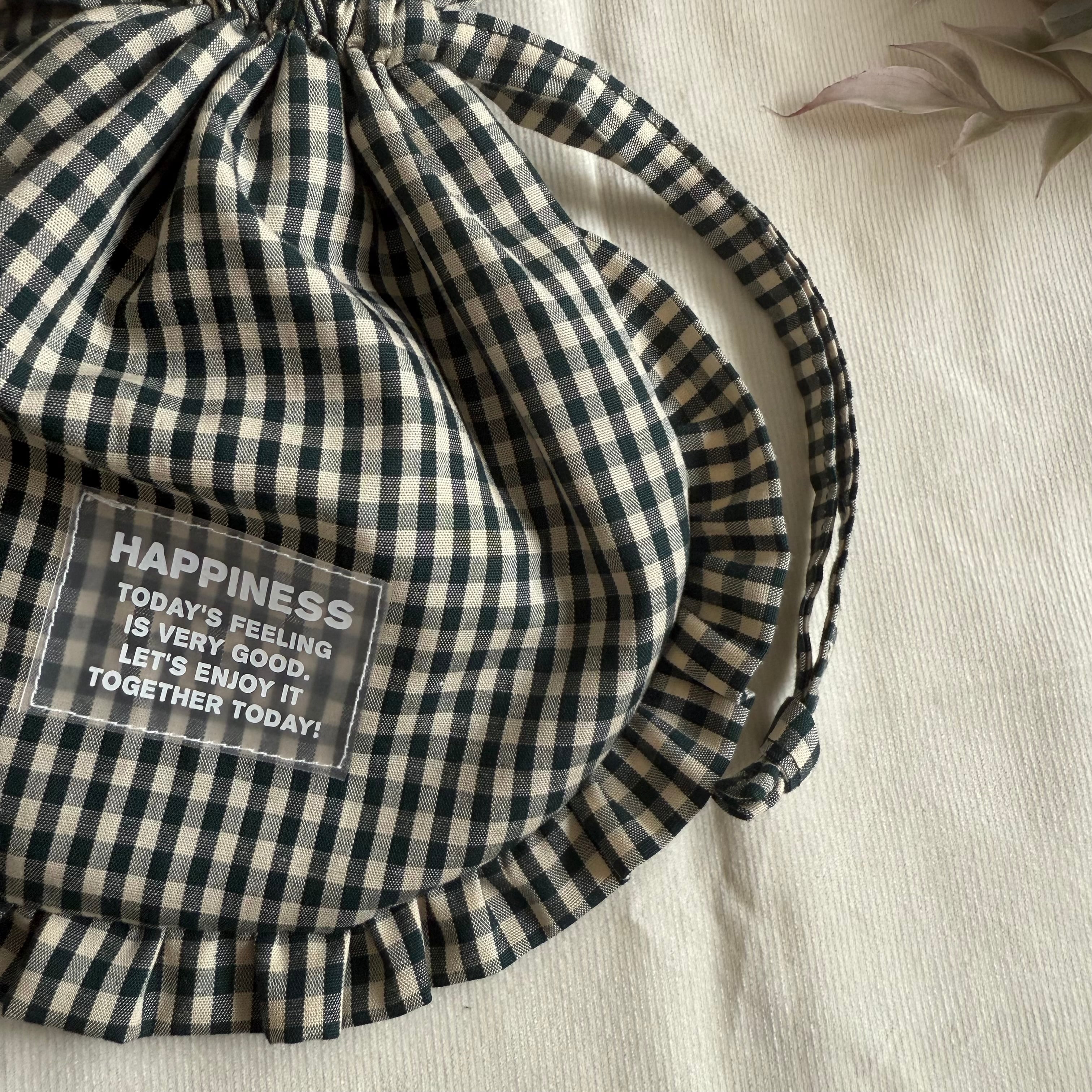 【まん丸フリル巾着】カーキギンガムチェック×ブラウン