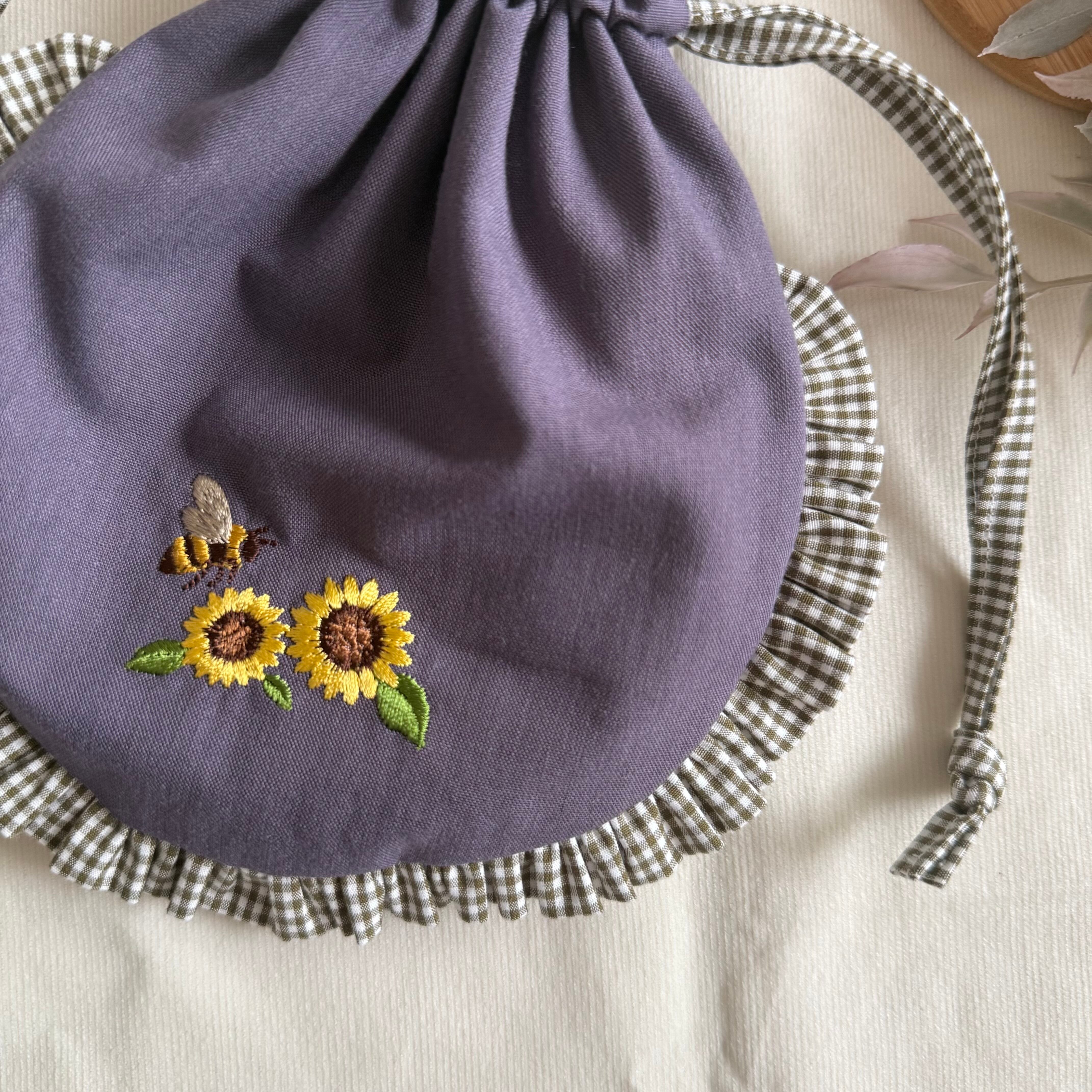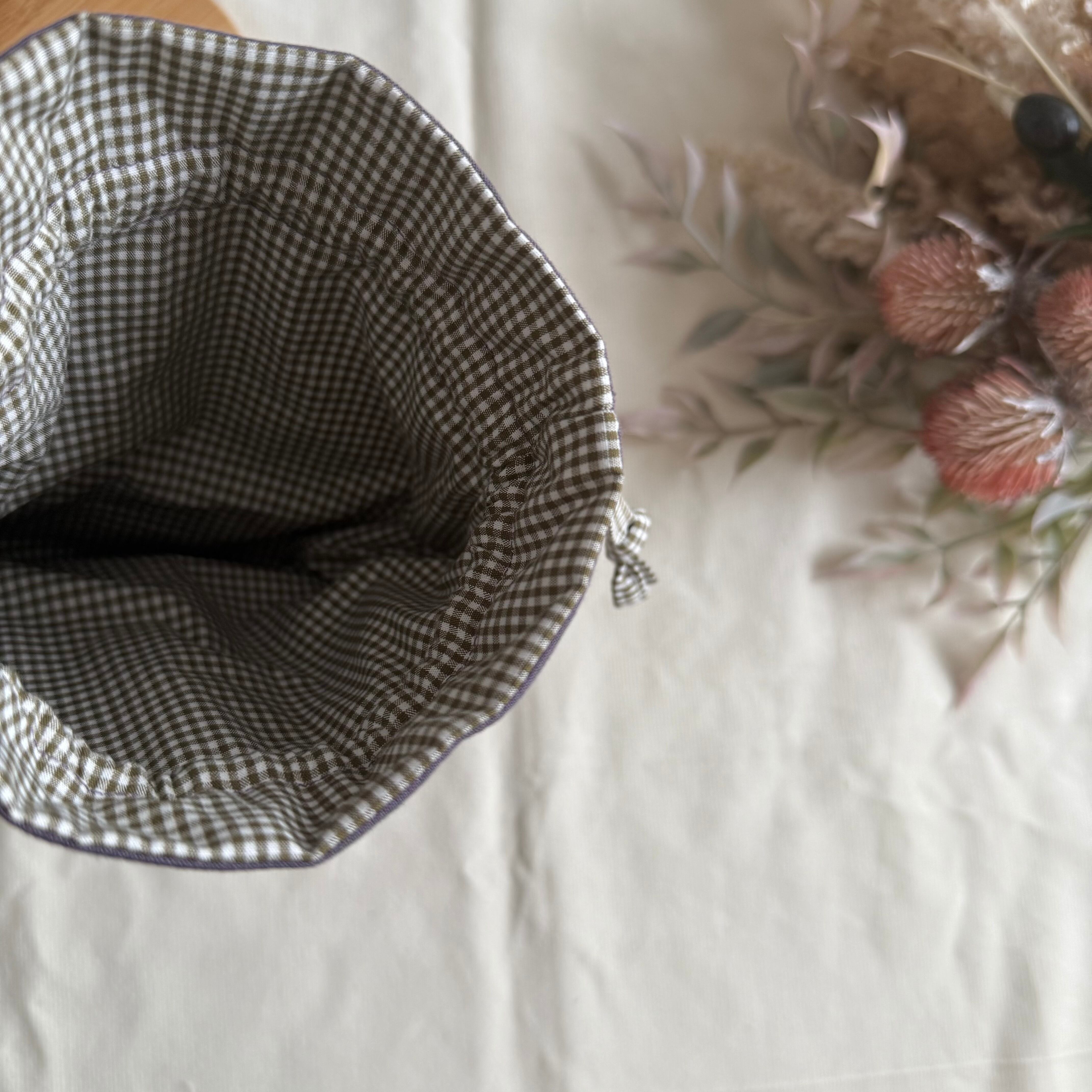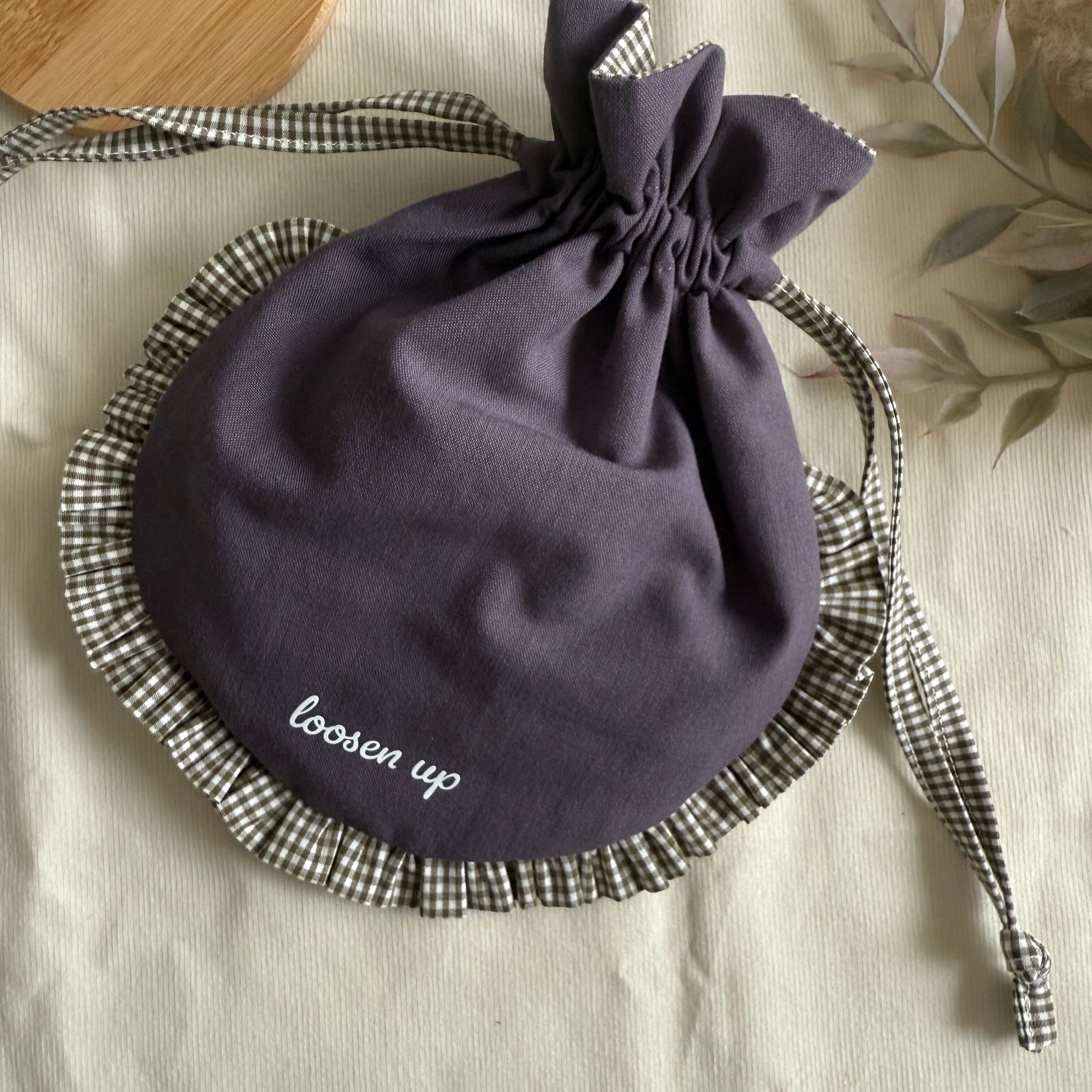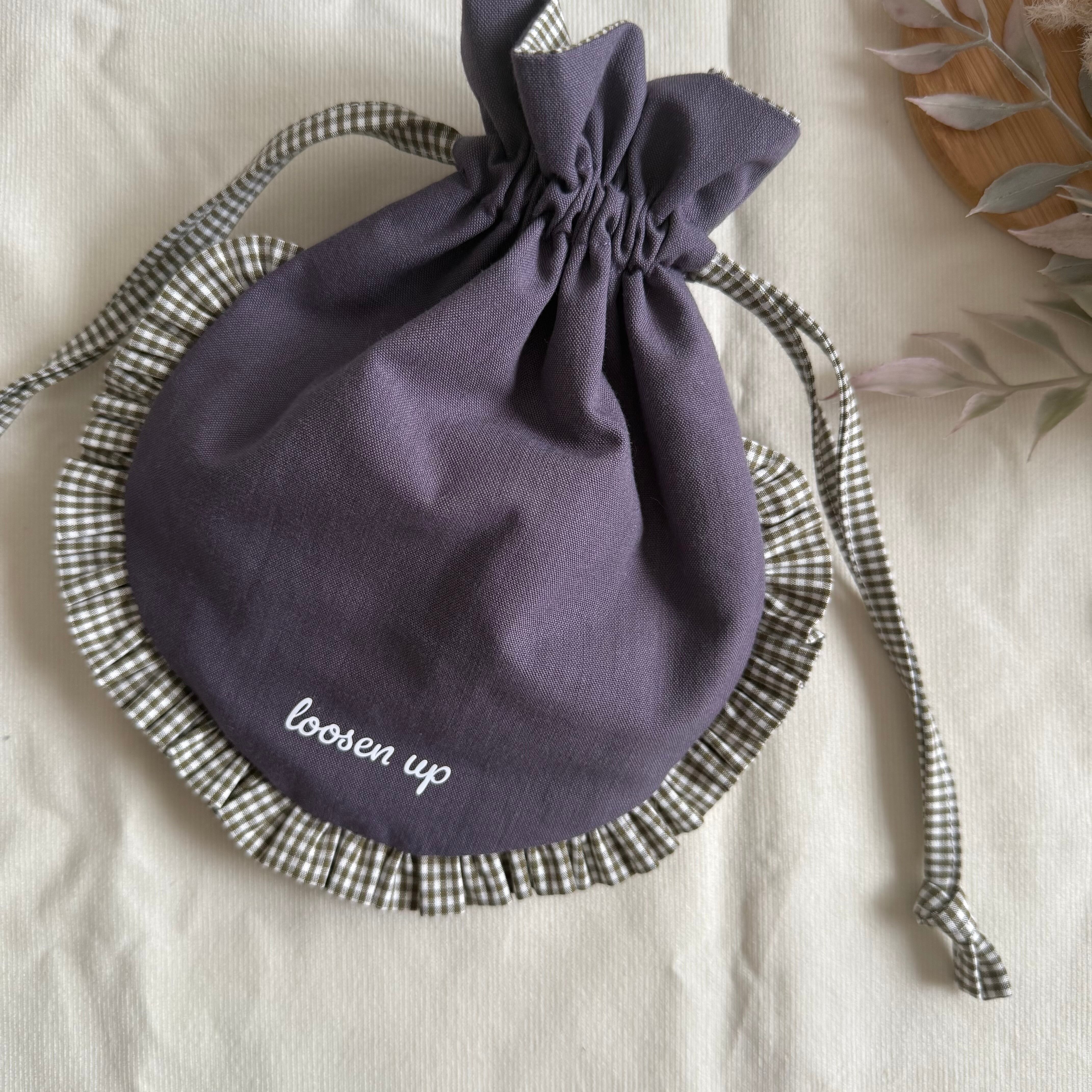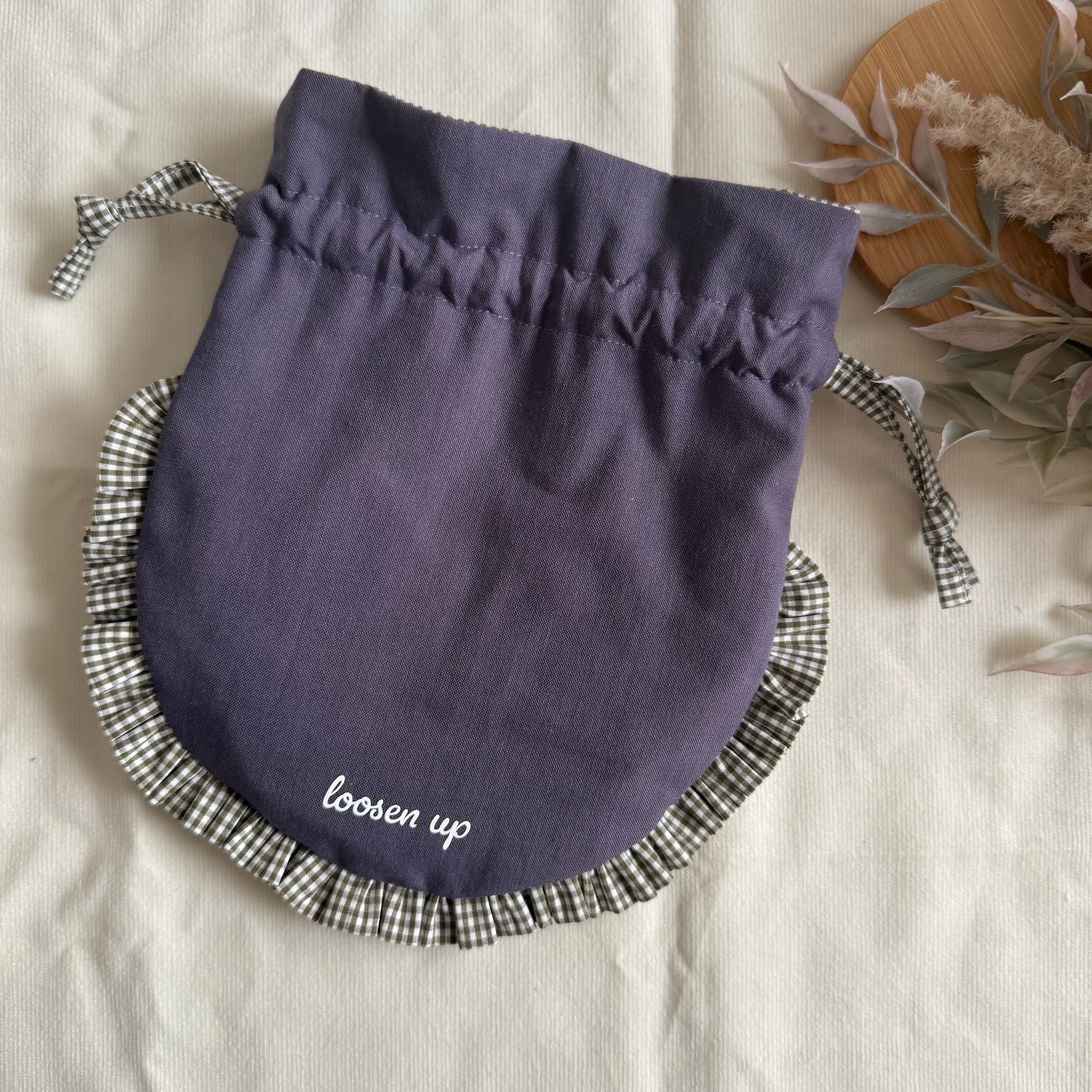 【まん丸フリル巾着】パープル×モスグリーンチェック